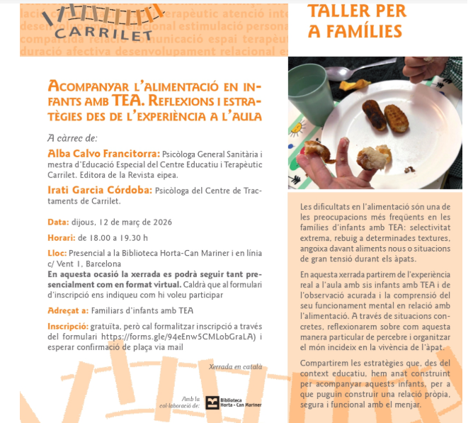 En aquesta xerrada es partirà de l’experiència real a l’aula amb sis infants amb TEA i de l’observació acurada i la comprensió del seu funcionament mental en relació amb l’alimentació. A través de situacions concretes, es reflexionarà sobre com aquesta manera particular de percebre i organitzar el món incideix en la vivència de l’àpat.